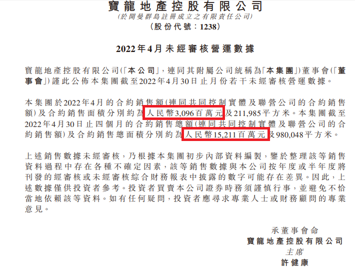 根據(jù)2022年4月寶龍地產的未經審核營運數(shù)據(jù),當月寶龍地產合約銷售額30.96億元,前4月合約銷售為152.11億元。