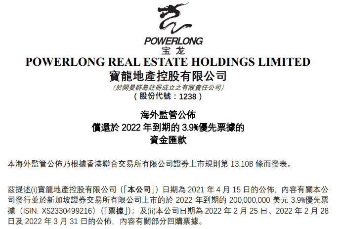 2022年4月初,杠桿地產注意到,寶龍地產曾發(fā)布一則公告,“海外監(jiān)管公布償還于2022年到期的3.9%優(yōu)先票據(jù)的資金匯款”。