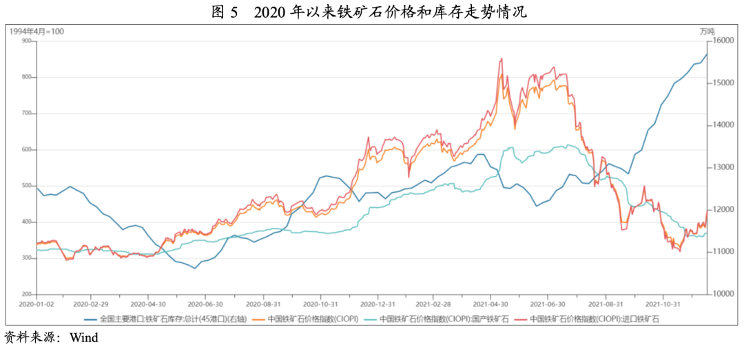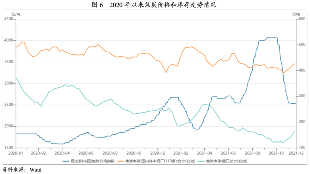 焦炭是支撐鋼鐵生產的基本原材料,中國鋼鐵行業焦炭供給主要來自國內煤炭企業。2021年上半年,煤炭生產受“雙碳”政策、環保要求、安全事故等多因素影響,焦炭供需出現錯配,焦炭價格波動較大。其中,3―4月,由于新焦爐陸續投產,加之河北地區鋼鐵限產,焦炭價格快速下跌。之后,環保限產、能耗雙控、焦煤進口受限等因素影響焦炭企業產量釋放,焦炭價格大幅上漲。但10月底以來,煤炭保供政策持續發力,焦炭庫存止跌反升,焦炭價格高位回落,但仍處于歷史較高水平。