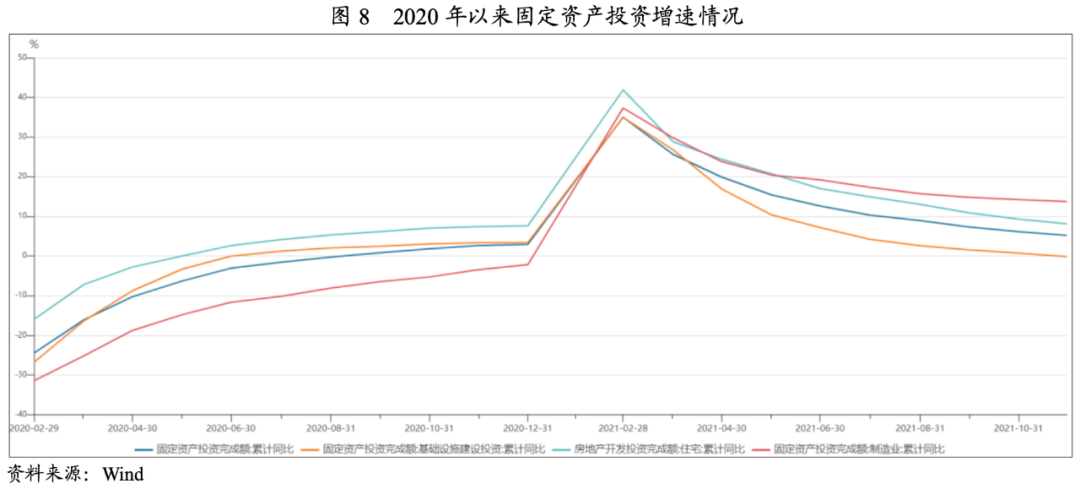 鋼鐵下游需求主要分為以房地產和基建為主的建筑業,以及以機械、汽車、家電、船舶等為主的制造業。其中,建筑業需求是中國鋼材消費的主要領域之一,消費量占比達鋼材總產量的一半以上,中國鋼鐵消費總量受宏觀經濟形勢影響明顯。2021年以來,鋼材表觀消費量先增后降,且下半年用鋼需求弱于往年。分行業來看,基建投資維持疲軟狀態,房地產投資增速下降明顯,相比之下制造業用鋼需求表現較好,但對鋼材整體消費量帶動有限。
