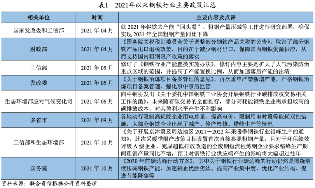 2021年是“雙碳”政策調控的元年,鋼鐵行業作為碳排放量最高的制造行業,受政策調控影響較大。各級政府主要通過限制產量和增加成本來控制鋼鐵行業總能耗,從而加速鋼企優勝劣汰,促進行業節能降碳。