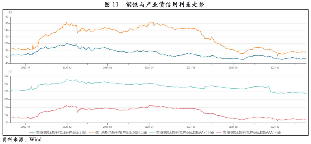 從發行成本來看,2021年初,由于鐵礦石價格大幅上漲,以及永煤違約事件引發的對強周期行業信用風險的擔憂,鋼鐵行業信用利差持續走擴。但二季度以來,隨著鋼鐵企業收入和利潤規模大幅增長,行業信用利差不斷收窄,且AAA鋼鐵債券信用利差降幅更為明顯。