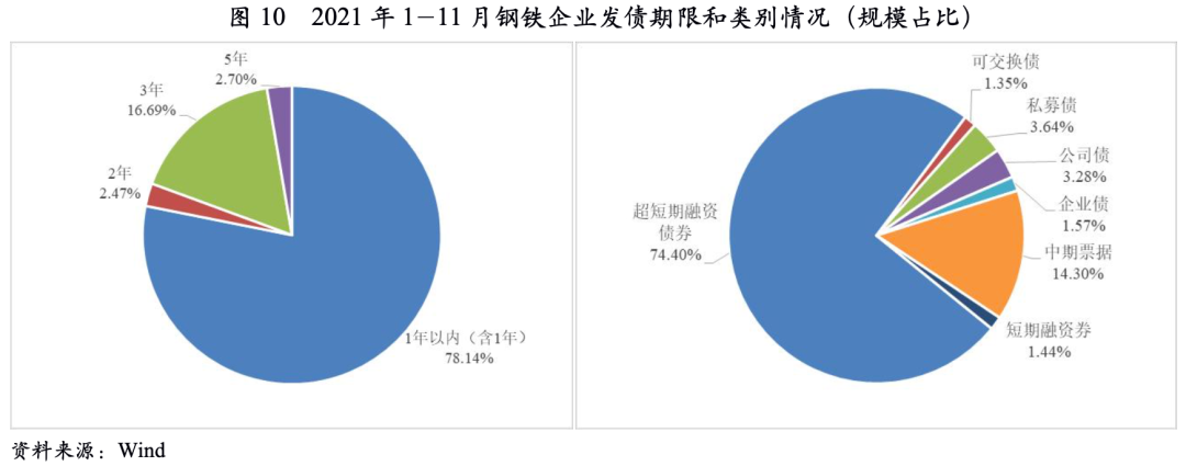 從發債期限和類型來看,2021年1―11月,鋼鐵企業發行的146只債券中期限在1年以內(含一年)的債券共109只,發行規模占78.14%,整體債券發行期限偏短;鋼鐵企業發行的債券類型較為豐富,銀行間市場產品規模占比高。