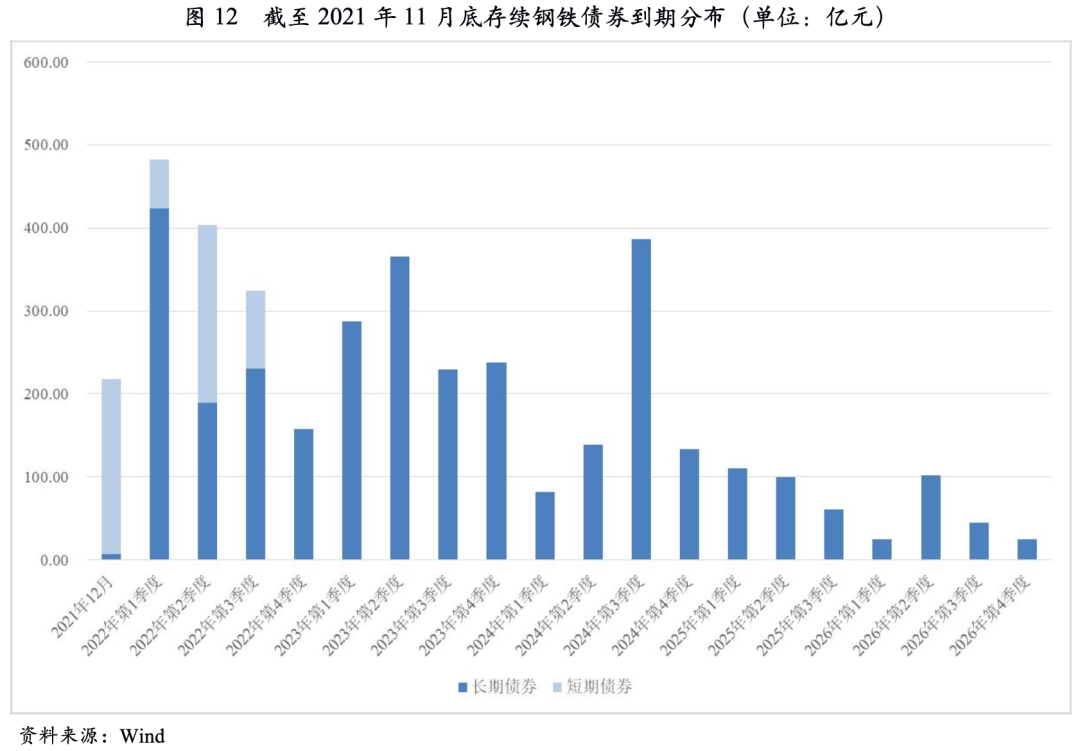截至2021年11月底,鋼鐵企業存續債券余額合計3913.44億元,涉及發行主體37家,其中AAA主體23家、AA+主體11家、AA主體3家;一年內到期債券規模1531.62億元,其中短期債券占37.67%、長期債券占62.33%,相較2021年以來新發債的規模尚可。考慮到鋼鐵企業發債以周轉為主,且發債企業主要為高信用等級的央企和地方國企,行業整體償債壓力較小。