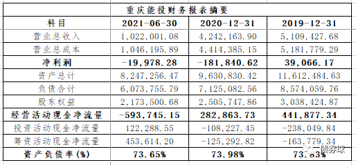 從公開披露信息來看,重慶能投最近兩年一期為2019年至2021年半年報,其主營業務收入呈現下滑趨勢,凈利潤則大幅下降,并出較大幅度的虧損;經營活動現金凈流量處于不斷下降,甚至惡化的狀態;而資產負債率則相對平穩,但是負債率較高,接近74%,總體來看財務情況并不理想。