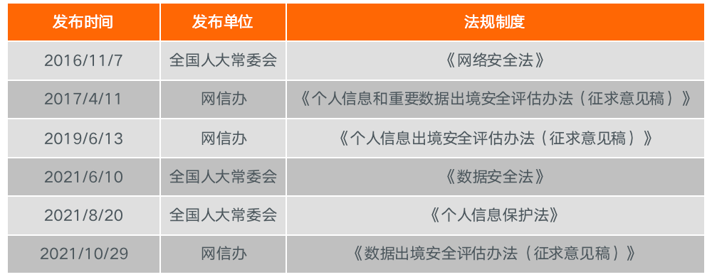 2016年11月7日,《網(wǎng)絡安全法》正式頒布,首次明確了數(shù)據(jù)出境需進行安全評估。之后,網(wǎng)信辦分別于2017年和2019年發(fā)布了《個人信息和重要數(shù)據(jù)出境安全評估辦法(征求意見稿)》和《個人信息出境安全評估辦法(征求意見稿)》,但由于《數(shù)據(jù)安全法》和《個人信息保護法》尚未實施,以上兩個評估辦法缺乏法律基礎,一直未出臺正式文件。