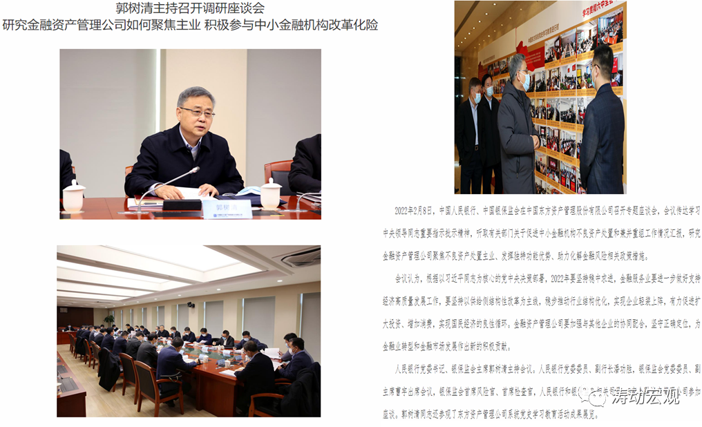 2022年2月10日,金融管理部門刊發(fā)一則新聞“2022年2月8日,郭主席主持召開調(diào)研座談會研究金融資產(chǎn)管理公司如何聚焦主業(yè) 積極參與中小金融機構(gòu)改革化險”。從發(fā)布的新聞稿來看,該座談會的參會嘉賓包括郭主席、潘功勝副行長、曹宇副主席、銀保監(jiān)會首席風險官和首席檢查官以及5家金融AMC(即信達、長城、東方、華融與銀河)(關于金融AMC的分析參見金融AMC、金融AIC與地方AMC手冊(2021年版)),其中有兩個表述值得關注: