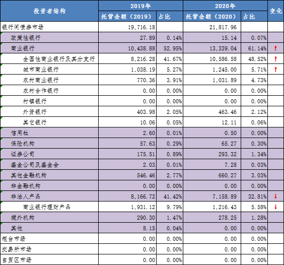從2020年末的數據來看,商業銀行和非法人產品(資管類賬戶)是持倉的絕對主力,持倉占比分別為61.14%和32.81%。