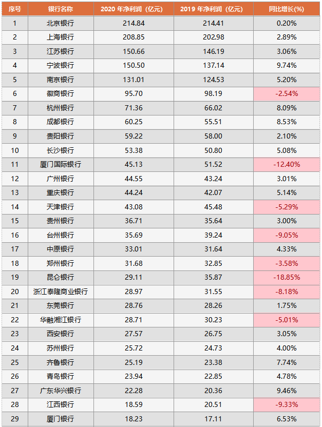 5家城商行的2020年凈利潤在100億以上,其中200億以上的涵蓋2家,即北京銀行214.84億元,上海銀行208.85億元;
