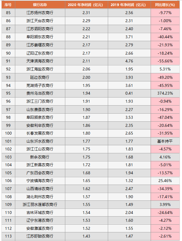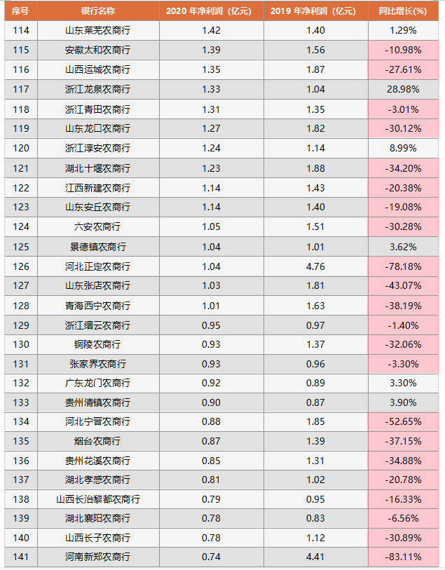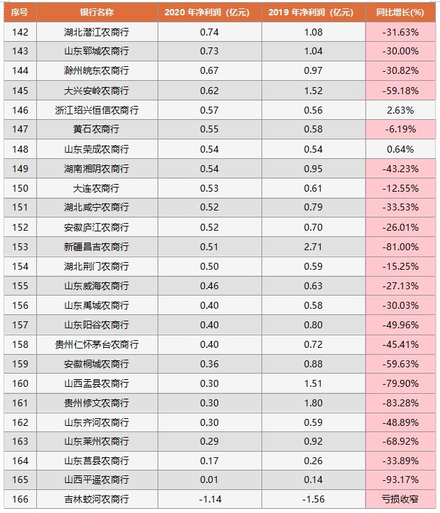 浙江縉云農商行、銅陵農商行、張家界農商行、廣東龍門農商行等38家農商行,凈利潤處于1億元以下,其中有33家呈現同比負增長,僅有4家銀行同比正增長,分別是廣東龍門農商行、貴州清鎮農商行、浙江紹興恒信農商行、山東榮成農商行,吉林蛟河農商行2020年虧損收窄,從2019年的-1.56億元到2020年的-1.14億元。