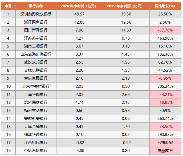 表6:18家民營銀行與法人直銷銀行披露的2019-2020年凈利潤變化表