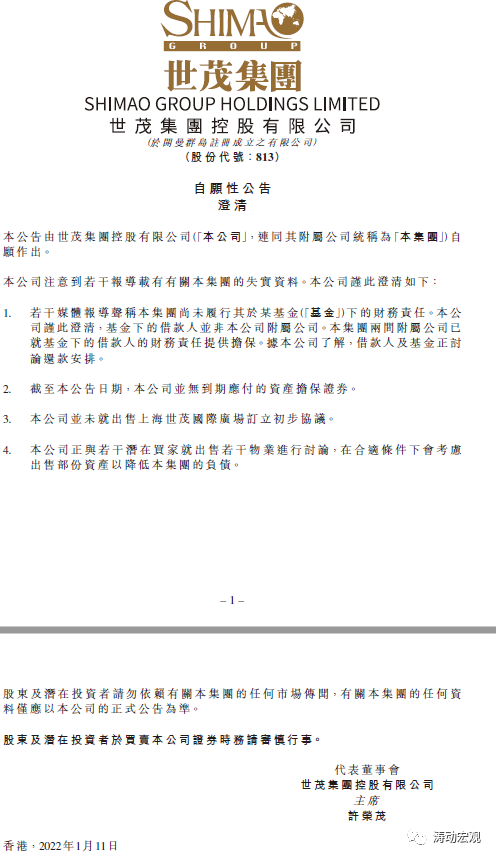 2022年1月11日,針對(duì)市場(chǎng)傳言世茂集團(tuán)未履行其于某基金下的財(cái)務(wù)責(zé)任事宜,世茂集團(tuán)發(fā)布澄清公告稱某基金下的借款人并非其附屬公司,其兩家附屬公司已就基金下的借款人的財(cái)務(wù)責(zé)任提供擔(dān)保、借款人及基金正討論還款安排,同時(shí)其目前無到期應(yīng)付的資產(chǎn)擔(dān)保證券、亦未就出售上海世茂國(guó)際廣場(chǎng)訂立初步協(xié)議,且正與若干潛在買家就出售若干物業(yè)進(jìn)行討論,以在合適條件下會(huì)考慮出售部分資產(chǎn)以降低本集團(tuán)的負(fù)債。意味著世茂系實(shí)際上正在處置相關(guān)資產(chǎn)。