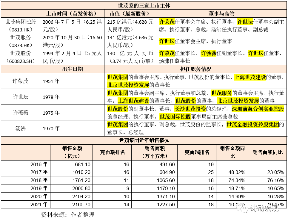 1、世茂系由許氏家族控制,分別為1951年出生的許榮茂(核心)、1978年出生的許世壇(許榮茂之子)和1975年出生的許薇薇(許榮茂之女以及許世壇的姐姐)。其中,許榮茂分別擔(dān)任世茂集團(tuán)與世茂股份的董事長(zhǎng),而許世壇則擔(dān)任世茂集團(tuán)的董事會(huì)副主席、總裁以及世茂服務(wù)的董事長(zhǎng)和世茂股份的董事。