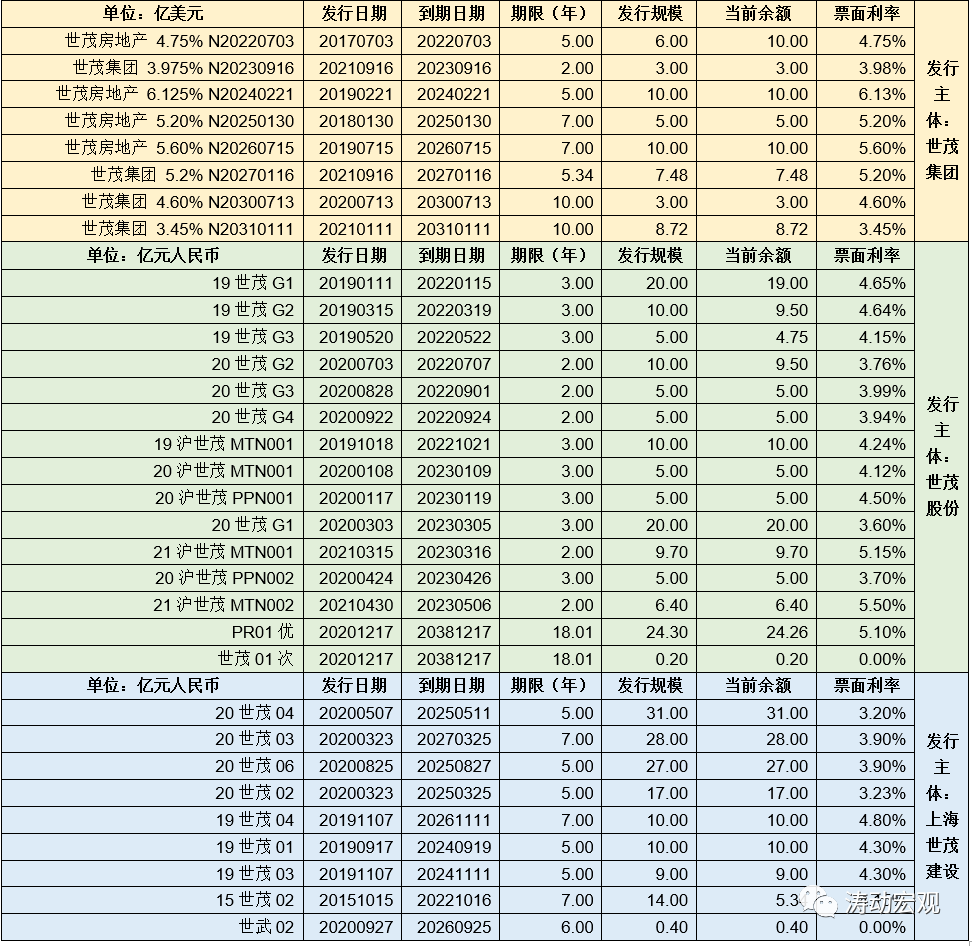 2、進(jìn)一步展望2022年來看,一季度到期債券余額28.50億元(由世茂股份發(fā)行的兩只債券)、二季度到期債券余額為4.75億元(由世茂股份發(fā)行的1只債券)、三季度到期債券余額為10億美元(由世茂集團(tuán)發(fā)行的1只債券)與19.50億元人民幣(由世茂股份發(fā)行的兩只債券)、四季度到期15.34億元人民幣(由世茂股份發(fā)行的1只債券和上海世茂建設(shè)發(fā)行的1只債券)。