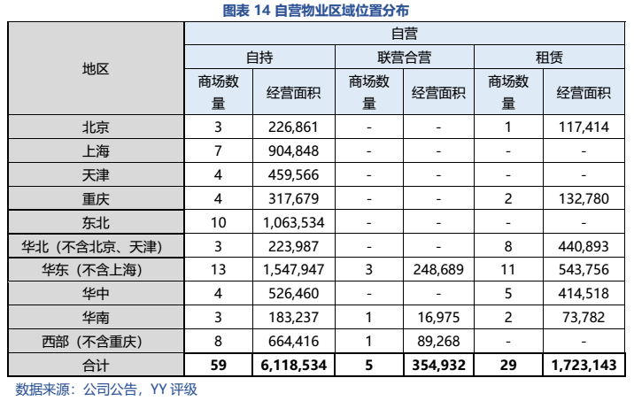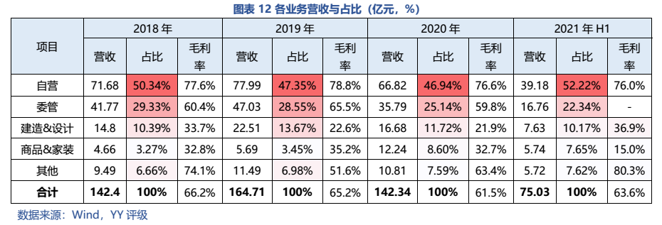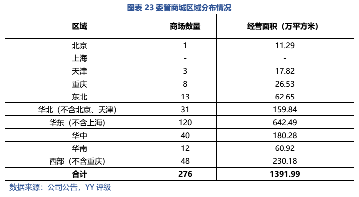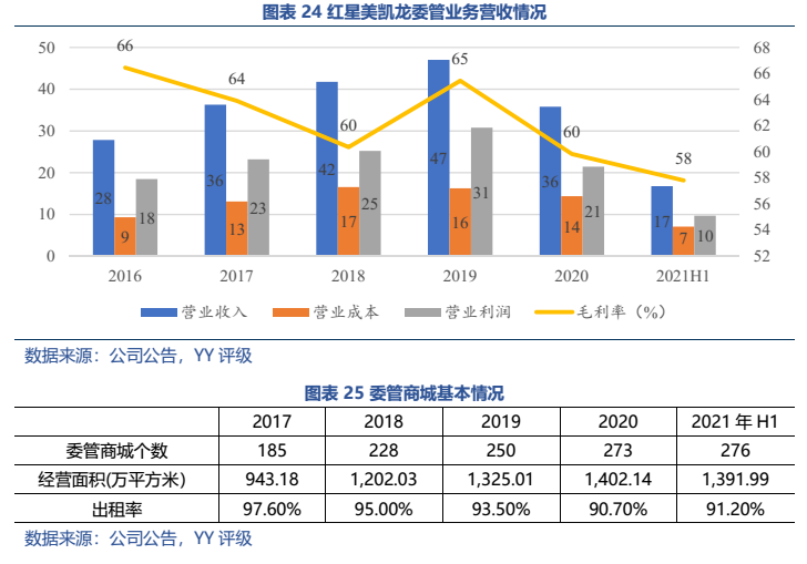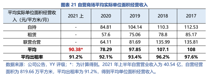 從經營表現(xiàn)來看:1)自營業(yè)務收入穩(wěn)定,自持商場分布于一二線核心城市,但整體來說,坪效走向下坡,回報率逐年下降。2)委管業(yè)務資金占用小,有一定的利潤貢獻,但未挑起大梁,且被質疑“假委管”,存在表外負債及隱性經營兜底的風險;3)公司預打造新增長點——零售及家裝業(yè)務,但尚處于發(fā)展期,當前利潤貢獻仍十分有限,且還需持續(xù)投入資金。