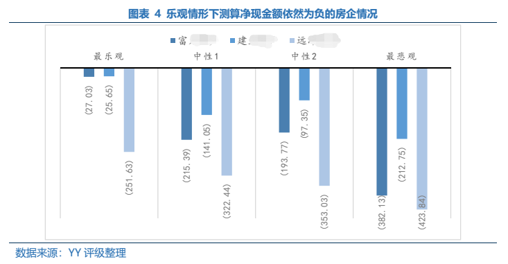 在最樂觀情形下,FL、JY等名字主體,仍是有資金缺口;而在中性1組合下,則RS、JK等接連扛不住,緊接著中性壓力測試2下則是Grennland等也加入陣營,而在去化和回款雙重降幅悲觀預期下,此前的YZ、ZN等主體紛紛中招。殺傷面之廣,似乎壓力的進行仍在進行中。