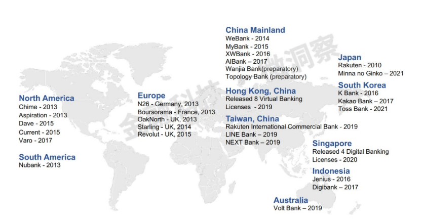 圖:全球各地區(qū)數(shù)字銀行分布情況(截至2021年)