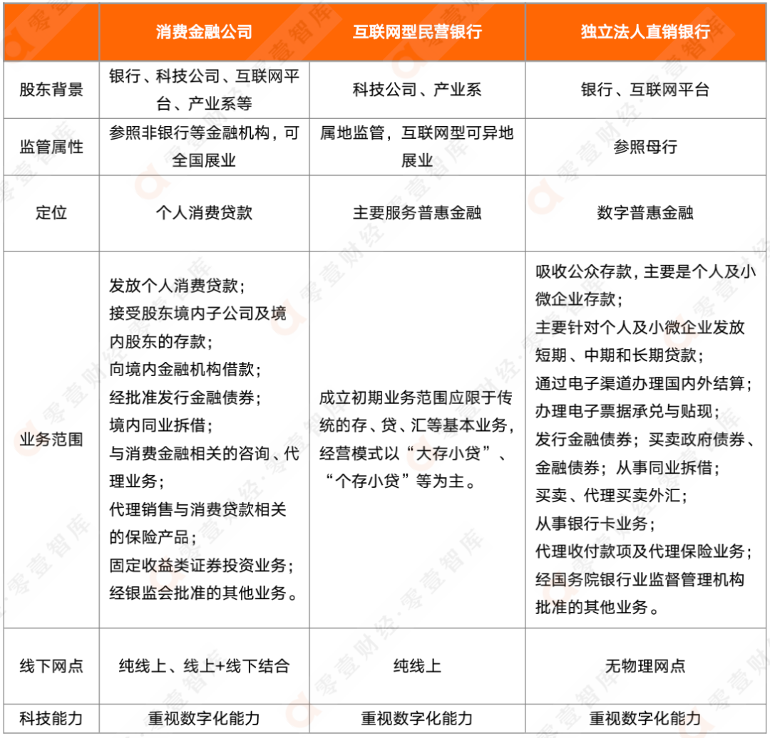 從監(jiān)管屬性來(lái)看,消費(fèi)金融公司、互聯(lián)網(wǎng)型民營(yíng)銀行、獨(dú)立法人直銷銀行均是可以全國(guó)展業(yè)的。經(jīng)營(yíng)模式來(lái)看,經(jīng)歷疫情以后,消費(fèi)金融公司基本轉(zhuǎn)為線上+線下結(jié)合的模式或是純線上模式,純線上模式的消費(fèi)金融公司完全符合數(shù)字銀行的要求。