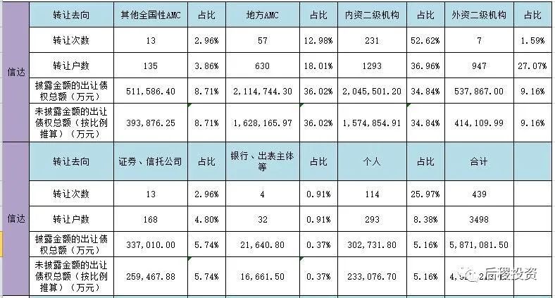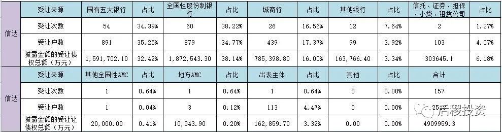 從受讓比例上看,信達的債權受讓來源主要還是國有五大行、全國性股份制銀行和城商行,其中國有五大行與全國性股份制銀行的規模相近,且總金額占比最高,城商行總金額占比雖然只有16%,但在四大AMC中仍然是占比最高的。