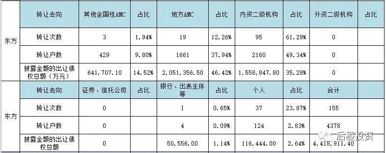 從債權出讓去向上看,東方與地方AMC的合作較信達更為緊密,出讓金額占比在所有全國性AMC中占比排名最高。與信達類似,內資二級機構和地方AMC占據了債權出讓的絕大多數,另轉向其他全國性AMC的債權雖然次數不多,但總金額占比也達到了14.52%。