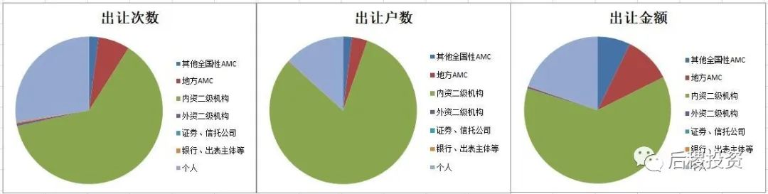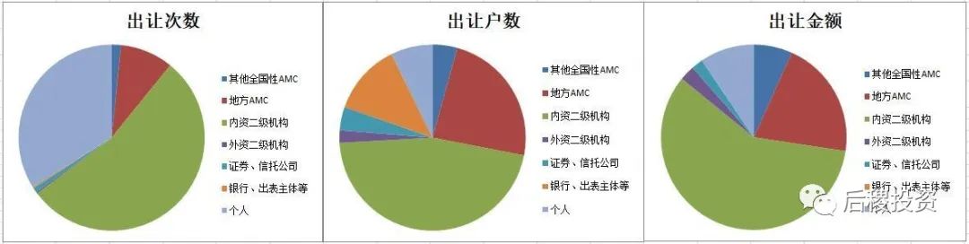 在出讓去向上,內資二級機構和地方AMC為主要合作方,二者合計占總出讓次數和戶數的一半以上,占總出讓金額的70.86%,其中內資二級機構和地方AMC的份額旗鼓相當,與地方AMC的合作較為密切,外資二級機構占比9.16%也大幅領先其他全國性AMC。