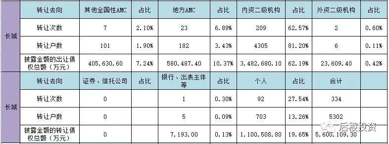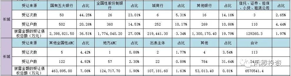 在長城的受讓來源中,城商行的受讓戶數較多但受讓金額較少,原因是其向貴州銀行購入的一筆債權戶數較多但債權總額較小。撇開此特例不談,其向國有五大行購入債權占比最多,全國性股份制銀行次之,城市行較少,其他銀行較多。其他銀行占比較多的很大一部分原因是從政策性銀行購入較多,其中有一筆由中國長城資產(國際)控股有限公司從國家開發銀行香港分行購入的70.59億元債權,只有6戶。