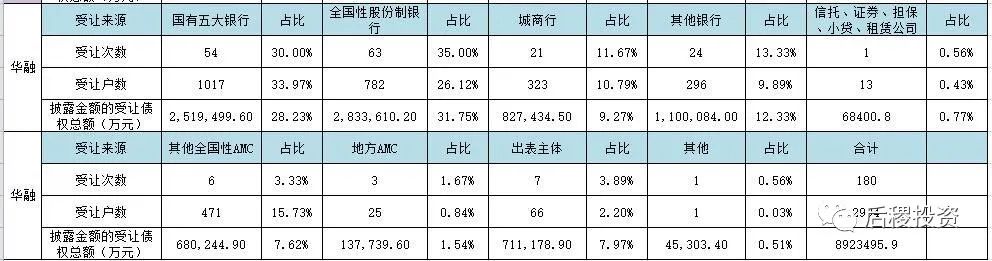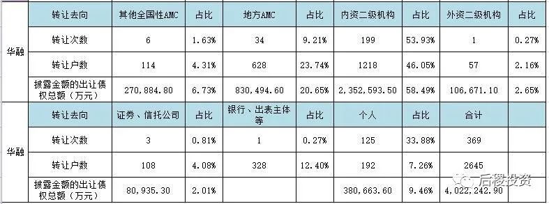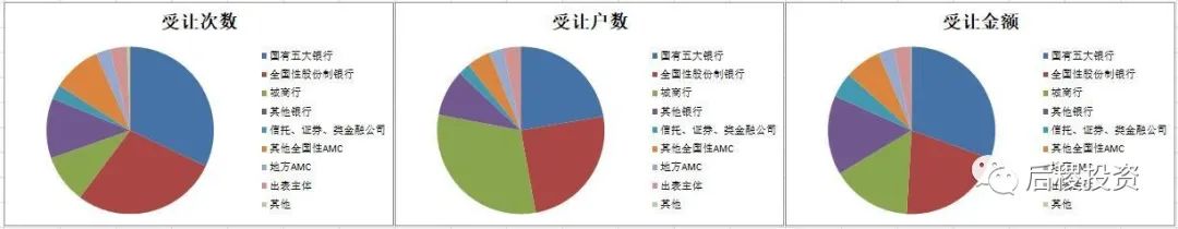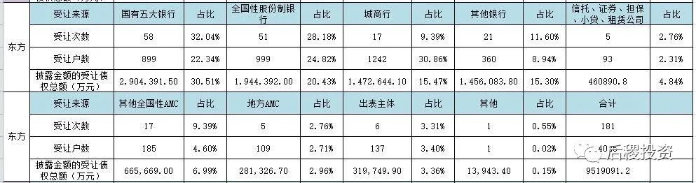 華融的債權受讓來源與東方類似,但國有五大行和全國性股份制銀行的占比相較于東方要稍微高一些,債權受讓來源較為多元化。
