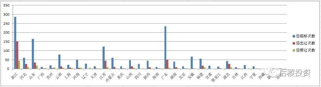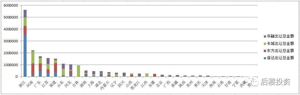 在出讓規模上,前五的省份依次是浙江、河南、廣東、江蘇和福建。其中信達在浙江的出讓規模尤其出眾,而浙江的出讓成交總規模也遠遠高出其他省份,屬當之無愧的最活躍市場。長城和東方在河南市場的出讓規模居前,而在廣東和江蘇市場,華融、長城和東方的表現接近。