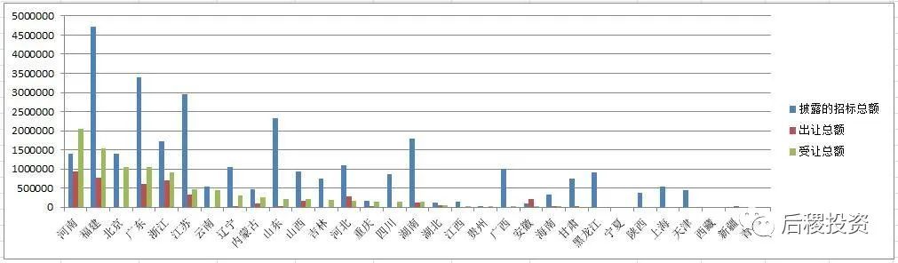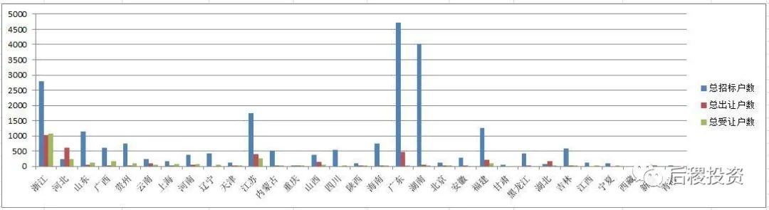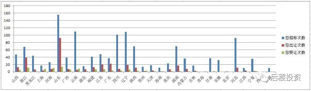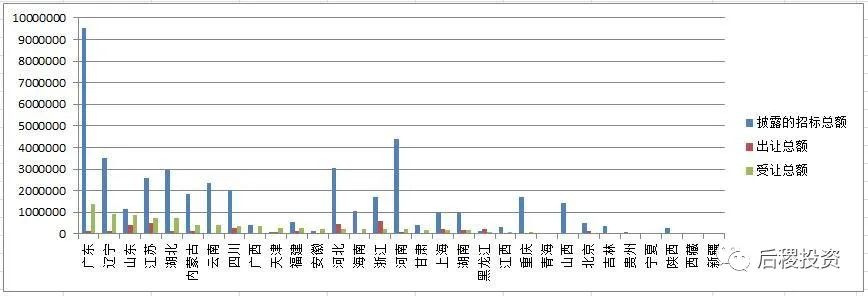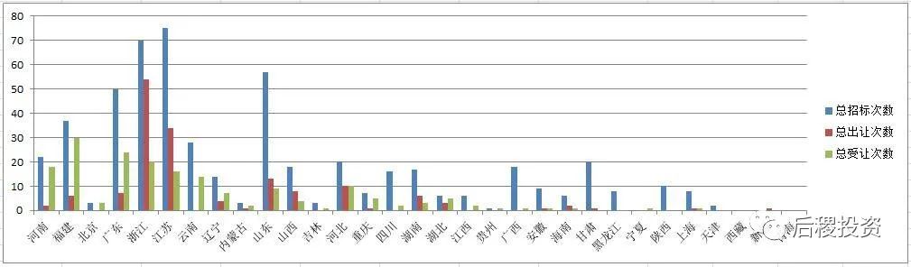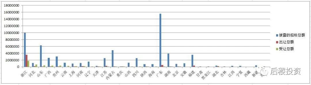 從招標次數上看,東方招標最多的省份依次是江蘇、浙江、山東、廣東和福建,而從戶數上看依次是廣西、廣東、云南、湖南和福建,從披露金額債權標的的總債權額看,依次是福建、廣東、江蘇、山東和浙江,造成這種不一致的原因在于招標資產包的性質不同,戶數多而金額少的可能是持有時間比較久的債權資產,比如廣西有兩個債權資產包,戶數分別是1872筆和2384筆,但總金額只有25.74億和36.94億元,可能屬于積壓債權的例行公告催收,亦可能是加大了處置力度。而單從成交金額情況上看,河南、福建、浙江、廣東和江蘇不論在出讓還是在受讓上,均是成交的重點地區,在北京、云南、遼寧、內蒙古和山東地區側重于收包,而在安徽地區則側重于出讓。