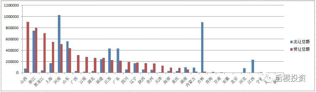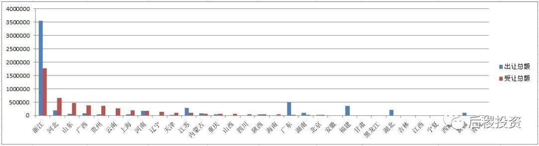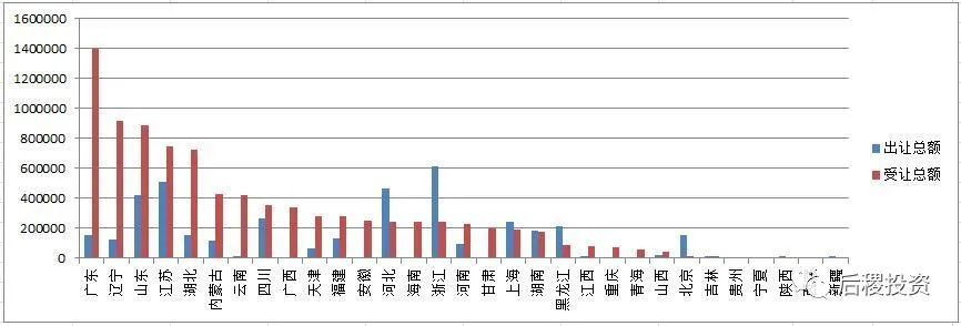 對比2018年,東方在河南、福建和北京的受讓規模均有大幅上升,廣東、浙江和江蘇也仍排在前列,從金額上來說,去年受讓規模超過50億元的有3個:廣東、江蘇和福建,而今年則有5個,而江蘇和云南也接近50億元。而從出讓上看,去年出讓較高的河北、山西和吉林今年規模都有收縮,這三個省份今年的出讓額也排在第10名以后。