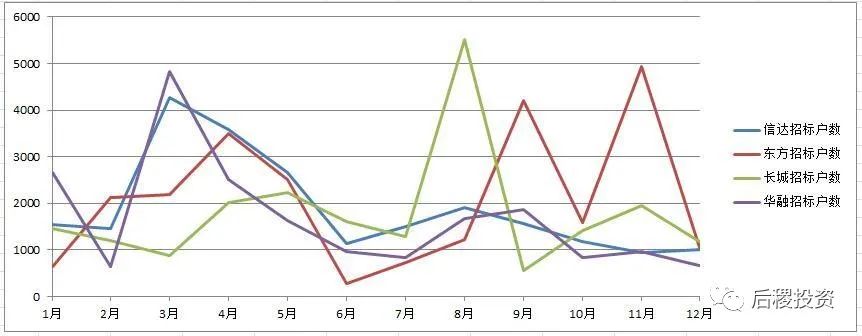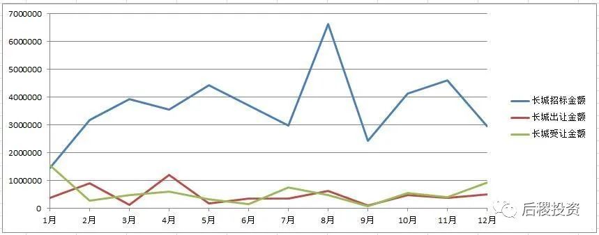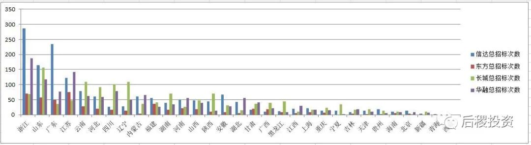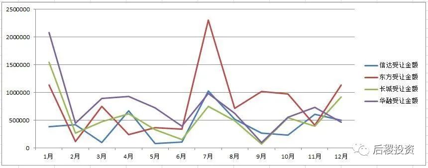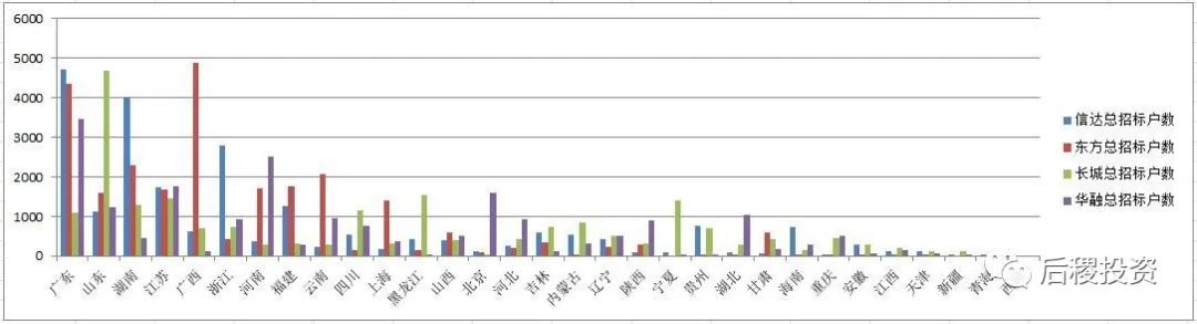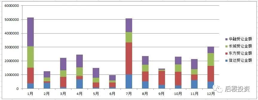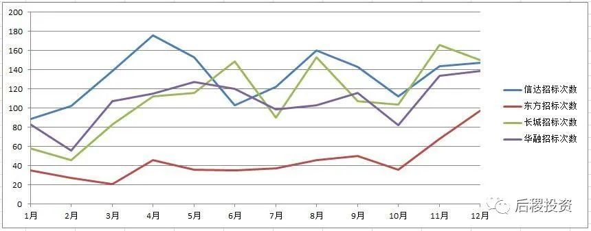 但從招標次數上看,信達在大多數月份里的招標次數均居前,而東方的招標次數則明顯低于其他三大AMC一檔。而從招標戶數上看,四大AMC的全年曲線均出現了糾纏,三月份的層次較為分明,長城在8月份,東方在9月份和11月份較其他AMC要高出不少。而在最重要的招標金額曲線上,全年則體現出層次分明到聚合糾纏的變化,從全年來看,招標規模仍是信達最高,東方最低,而長城和華融相近。從全年的招標總金額看,3月、8月和11月表現略微突出,長城的招標時段是在去年下半年,而其他各AMC則全年較為平均。