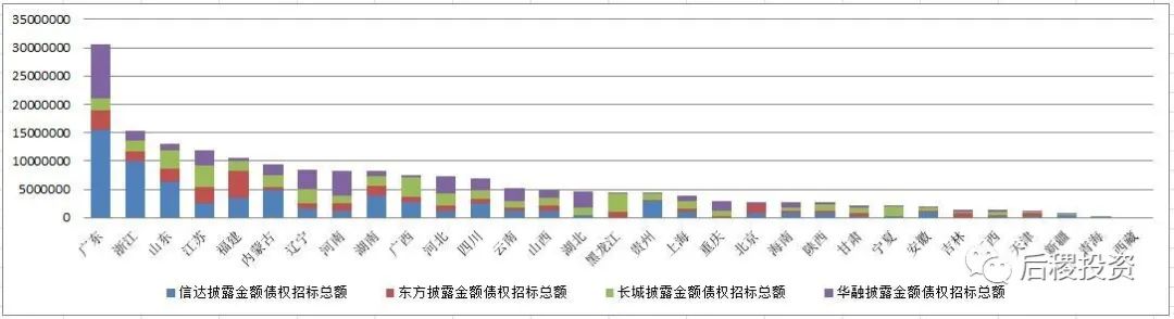 四大的總招標規模最多的省份前五是廣東、浙江、山東、江蘇和福建,但各AMC的側重點各有不同,華融和信達占了廣東省債權招標的絕大多數。事實上信達在各個省份的招標規模均處在前列,在廣東、浙江、江蘇、內蒙古、湖南和貴州均接近半數。華融在廣東、遼寧、河南、河北、云南、湖北的招標相對其他AMC較多,東方在福建、江蘇的招標規模領先,長城則在全國各地招標規模比較均衡。