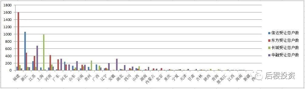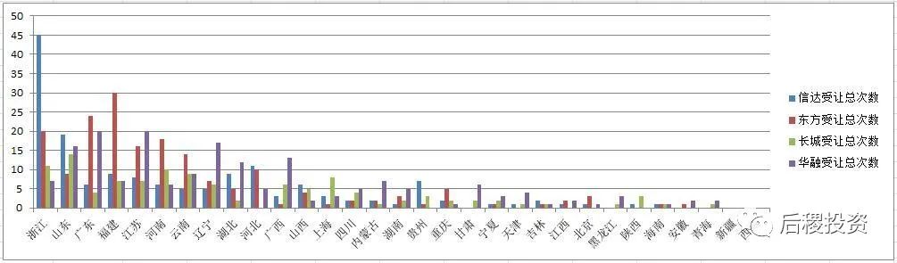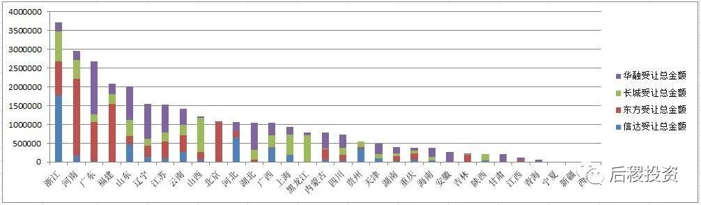 從華融的招標次數上看,排前五的是浙江、江蘇、山東、四川和廣東,而從戶數上看排前五的是廣東、河南、江蘇、北京和山東,而從金額上看,廣東、河南、遼寧、河北和湖北。從成交情況上看,浙江、江蘇和山東的招標和出讓對比情況,較其他地區更好。華融受讓前五的省份依次是廣東、遼寧、山東、江蘇和湖北,另外內蒙古、浙江、四川、廣西和云南也較其他地區為好,而出讓上,則以浙江、江蘇、河北、山東、四川為主,亦可以看出受讓往西南地區偏移的傾向,但受讓的重點還是在廣東地區和遼寧地區,這與其他三大AMC明顯不同。
