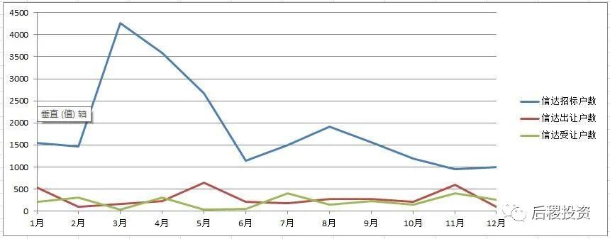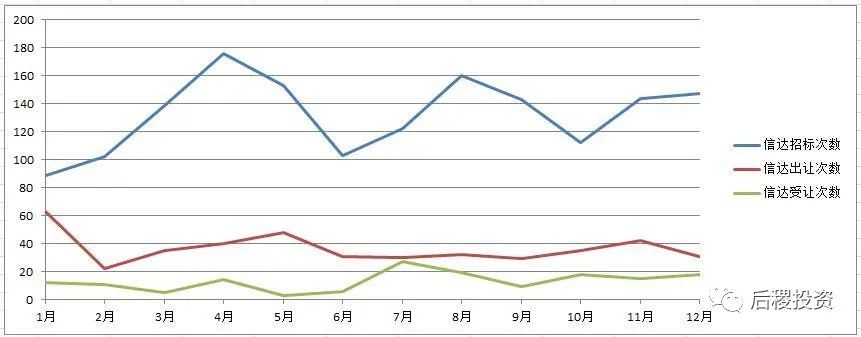 信達的招標次數在全年體現出一種較為平緩的波浪線,即在每月130左右上下浮動,招標戶數和金額在3月份出現了一次大的波動,總體來說全年較為均衡。出讓次數較受讓次數高出一個水平,但出讓金額和受讓金額的全年曲線出現了糾纏,這是因為,信達有很大一部分債權標的的公告信息并未透露債權金額,如將這部分金額考慮進去,則全年的出讓金額曲線應該與戶數或次數曲線一致,出讓金額曲線高于受讓金額曲線一個水平。而從曲線幅度上看,信達全年各月的出讓與受讓情況較為平均。