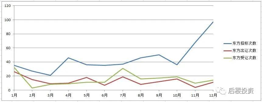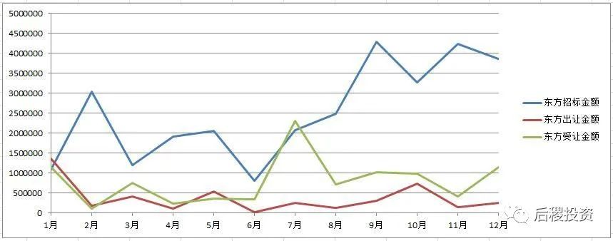東方的招標規模在2019年4季度出現了一個大的攀升,而招標曲線與出讓、受讓曲線的高度,較信達并未表現得差距過于巨大。去年7月份是東方受讓的高峰期,由于公告期較實際招標期有時間間隔,故實際的受讓高峰期應當是6月份。