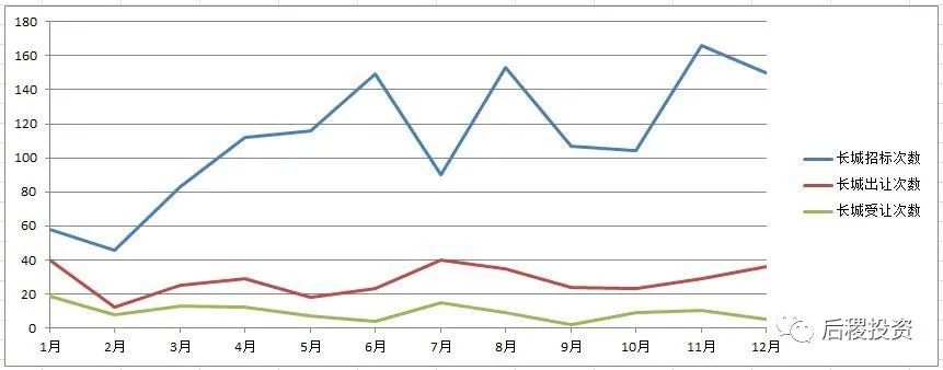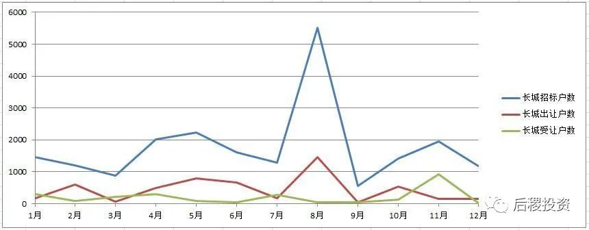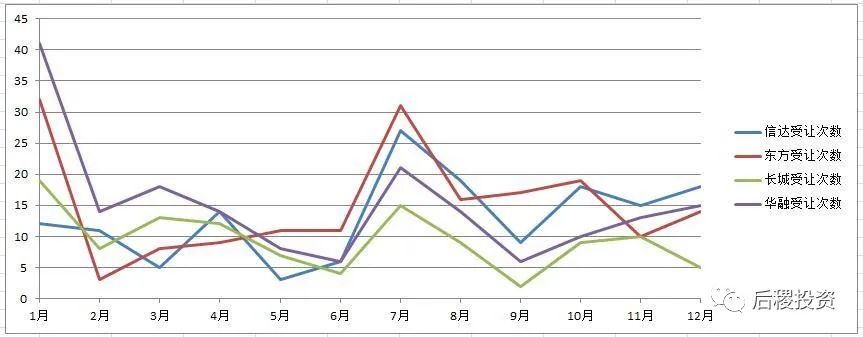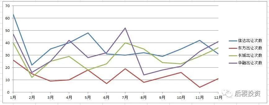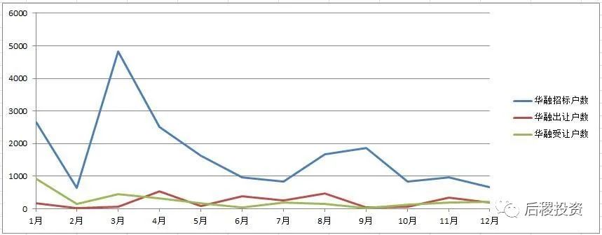 華融的招標規模在全年各月振幅較大,但總體仍舊是在每月350億左右上下浮動。華融的受讓金額曲線要略高于出讓金額曲線一檔,出讓的戶數與受讓戶數曲線糾纏,但出讓次數曲線則明顯略高于受讓次數曲線,此種情況的解釋與長城類似,可能是出讓的債權包以存量居多。