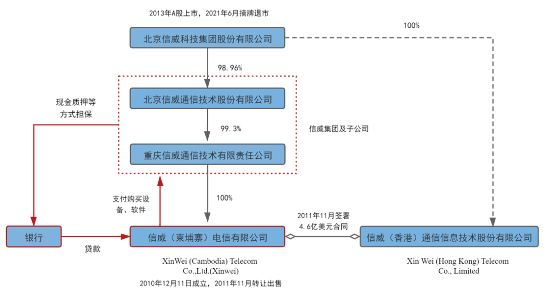 以柬埔寨地區(qū)為例,信威集團(tuán)在上市之際在當(dāng)?shù)氐闹饕献鞣胶屠麧?rùn)來(lái)源都是“信威(柬埔寨)電信有限公司”,英文名XinWei (Cambodia) Telecom Co.,Ltd.(Xinwei)。由信威集團(tuán)子公司重慶信威通信技術(shù)有限責(zé)任公司在2010年12月設(shè)立。2011年10月,重慶信威對(duì)外轉(zhuǎn)讓了該公司全部股權(quán)。