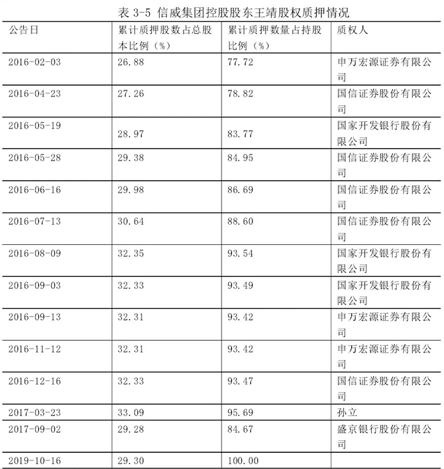 公開資料顯示,2016至2017年間,信威集團(tuán)董事長(zhǎng)兼最大股東王靖陸續(xù)將其個(gè)人持有股份全部質(zhì)押,質(zhì)押機(jī)構(gòu)包括國(guó)家開發(fā)銀行、盛京銀行和各大證券公司。通過(guò)上述股權(quán)質(zhì)押操作,王靖累計(jì)獲得現(xiàn)金超百億元。
