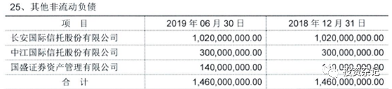 某平臺披露,其2019年6月底其他非流動負債的余額為14.6億,其中兩筆為信托融資,其余一筆為資管公司融資。具體的融資成本、融資期限還需要向發行人做進一步了解。