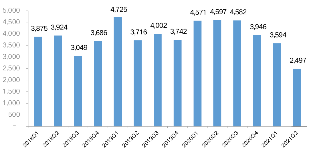 圖:2018年-2021年上半年房企季度融資情況(單位:億元)