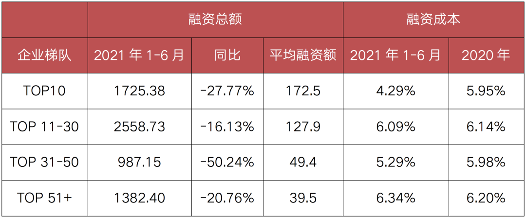 表:2021年各梯隊(duì)房企融資規(guī)模變化(單位:億元)