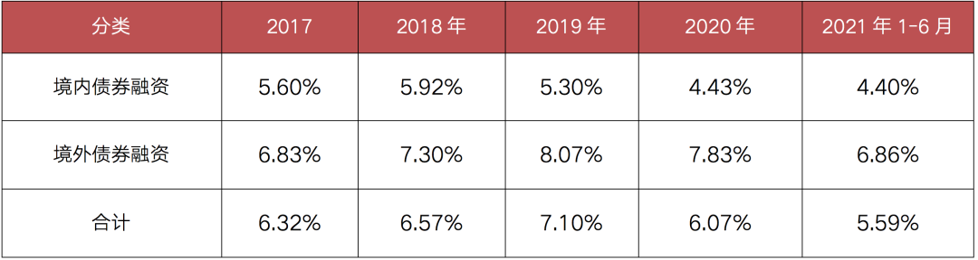 截至2021年6月,100家典型房企新增債券類融資成本為5.59%,較2020年下降0.48個(gè)百分點(diǎn),其中境外債券融資成本達(dá)6.86%,下降0.97個(gè)百分點(diǎn),境內(nèi)債券融資成本4.40%,較2020年下降0.03個(gè)百分點(diǎn)。