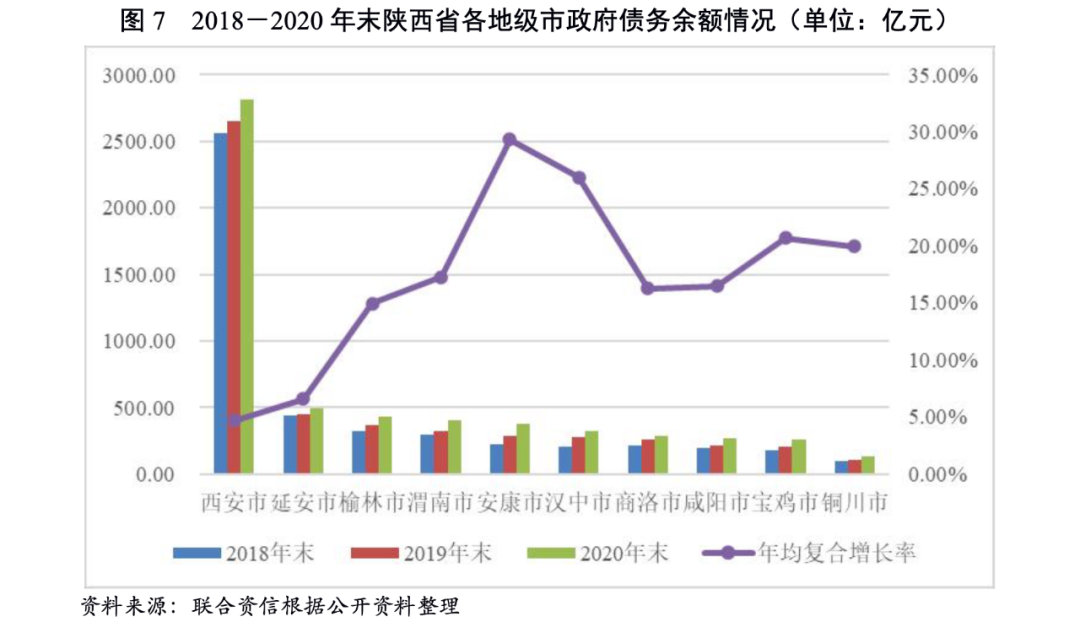 從政府債務層面看,陜西省各地級市政府債務余額規模均持續走擴,除西安市外,其他地級市2018-2020年末年均復合增長率均超過10%,其中安康市和漢中市年均復合增長率均超過25%。2020年末省會西安市政府債務余額大幅領先其他地級市,約占陜西省政府債務余額的1/3,其次是延安市、榆林市及渭南市,以上3個地市政府債務余額均在400億元以上,其余地級市政府債務余額均在400億元以下,其中銅川市政府債務余額規模最小,為134.11億元。