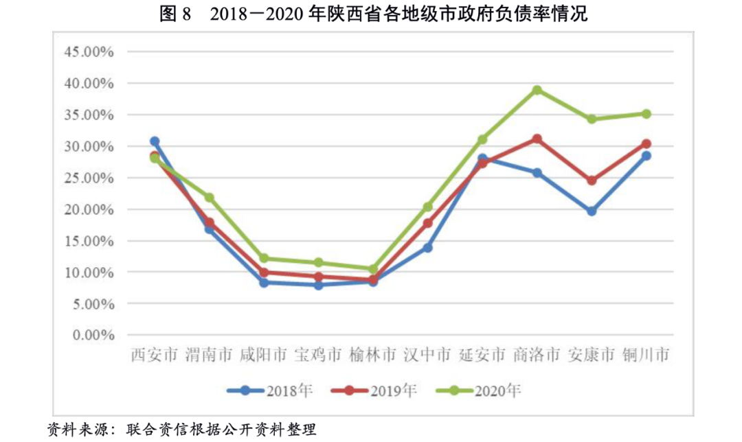 從各地區債務負擔來看,“發債城投企業全部債務+地方政府債務”/GDP最高的地級市為西安市,達99.32%;其次為延安市的62.94%和商洛市的54.97%;其他區域均低于50.00%,其中榆林市的比值最低,僅為18.41%。