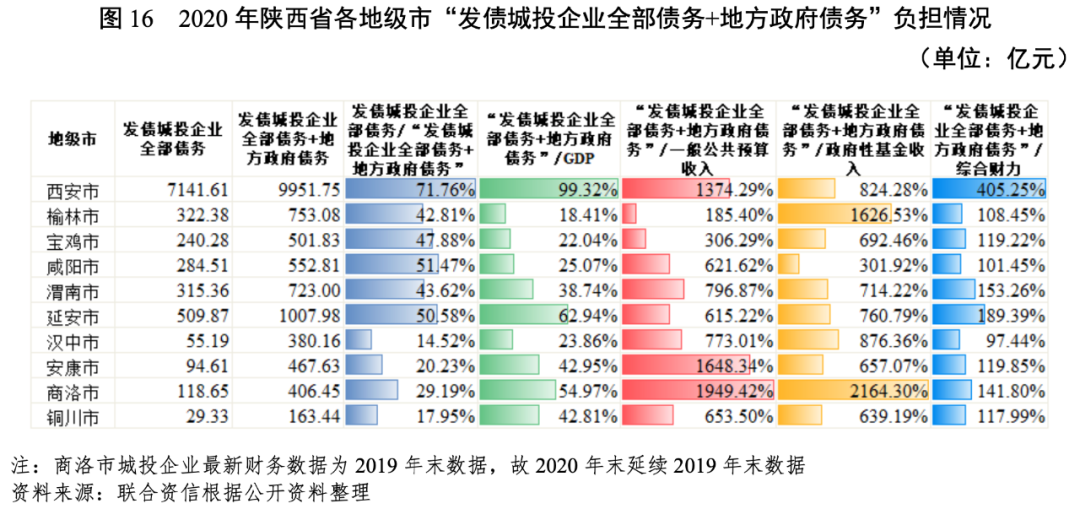 從各地級市政府綜合財力對“發債城投企業全部債務+地方政府債務”的保障支持程度來看,2020年地方綜合財力對“發債城投企業全部債務+地方政府債務”覆蓋程度最低的為西安市,其次為延安市和渭南市,覆蓋程度相對較高的為咸陽市和漢中市。