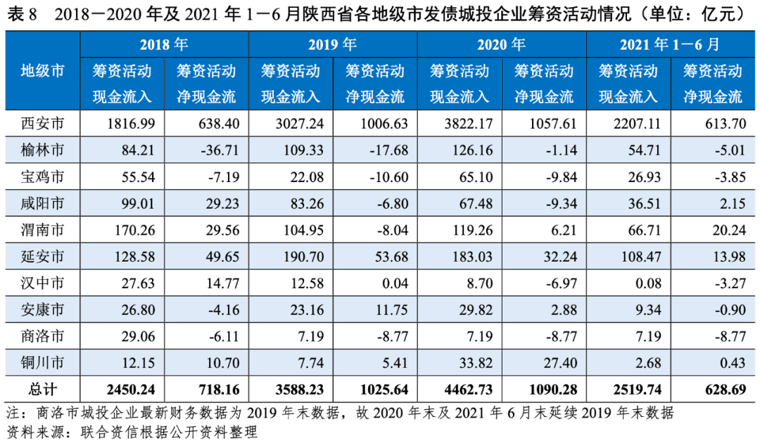 從企業層面看,陜西省發債城投企業數量相對較少,行政級別以園區類城投企業為主,主要分布于西安市、渭南市、榆林市和延安市。2020年以來,陜西省大部分發債城投企業債務負擔有所上升,各地級市發債城投企業債務償還仍主要依賴于外部籌資,各地級市融資狀況存在一定差異。從償債能力看,陜西省各地級市的發債城投企業短期償債能力指標呈不同程度的下降,咸陽市、延安市和漢中市短期償債壓力相對較大。從綜合財力對地方債務的覆蓋程度來看,覆蓋程度有所分化,需關注面臨集中償付壓力和地區債務負擔較重的地級市的城投企業的再融資情況。