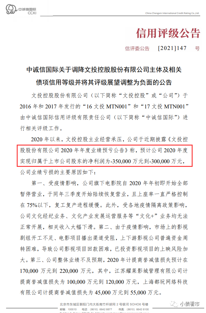中誠信國際認為,2020年文投控股業(yè)績大幅虧損且短期償債壓力加大,同時其影城經(jīng)營、影視投資制作及網(wǎng)絡(luò)游戲業(yè)務(wù)的回升仍存在不確定性, 公司2021年業(yè)績改善有待進一步觀察。