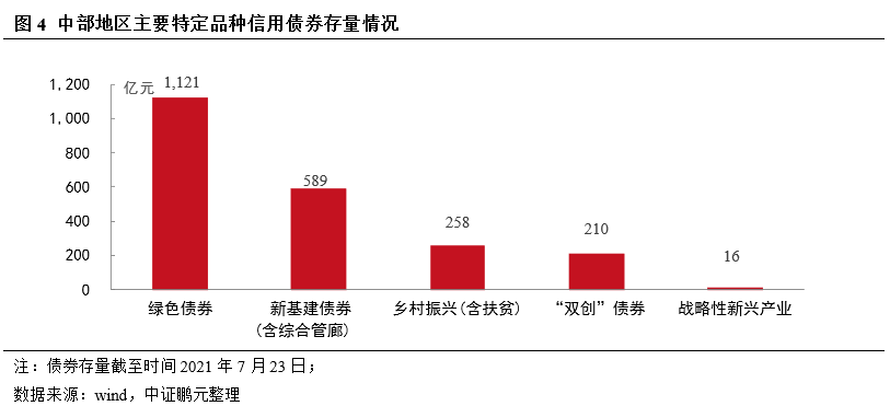 根據《意見》,綠色債券、鄉村振新債券(含扶貧)、“雙創”債券、戰略性新興產業專項債券、新型基建領域專項債券等特定品種債券可成為中部地區高質量發展的推手。上述特定品種信用債券,中部地區的存量余額為2,193.59億元,占全國總余額的16%,略低于區域全部信用債18%的占比,仍有較大提升潛力。綠色債券、新基建(含綜合管廊)專項債是現階段主要的特定品種債券,其中綠色債券存量余額1,120.90億元,遠高于其他特定品種債券種類。《意見》中多次提到“綠色”相關概念,堅持綠色發展和實現碳中和也是我國長期國策。在政策支持和鼓勵下,中部地區利用創新債券品種的水平將進一步提升。