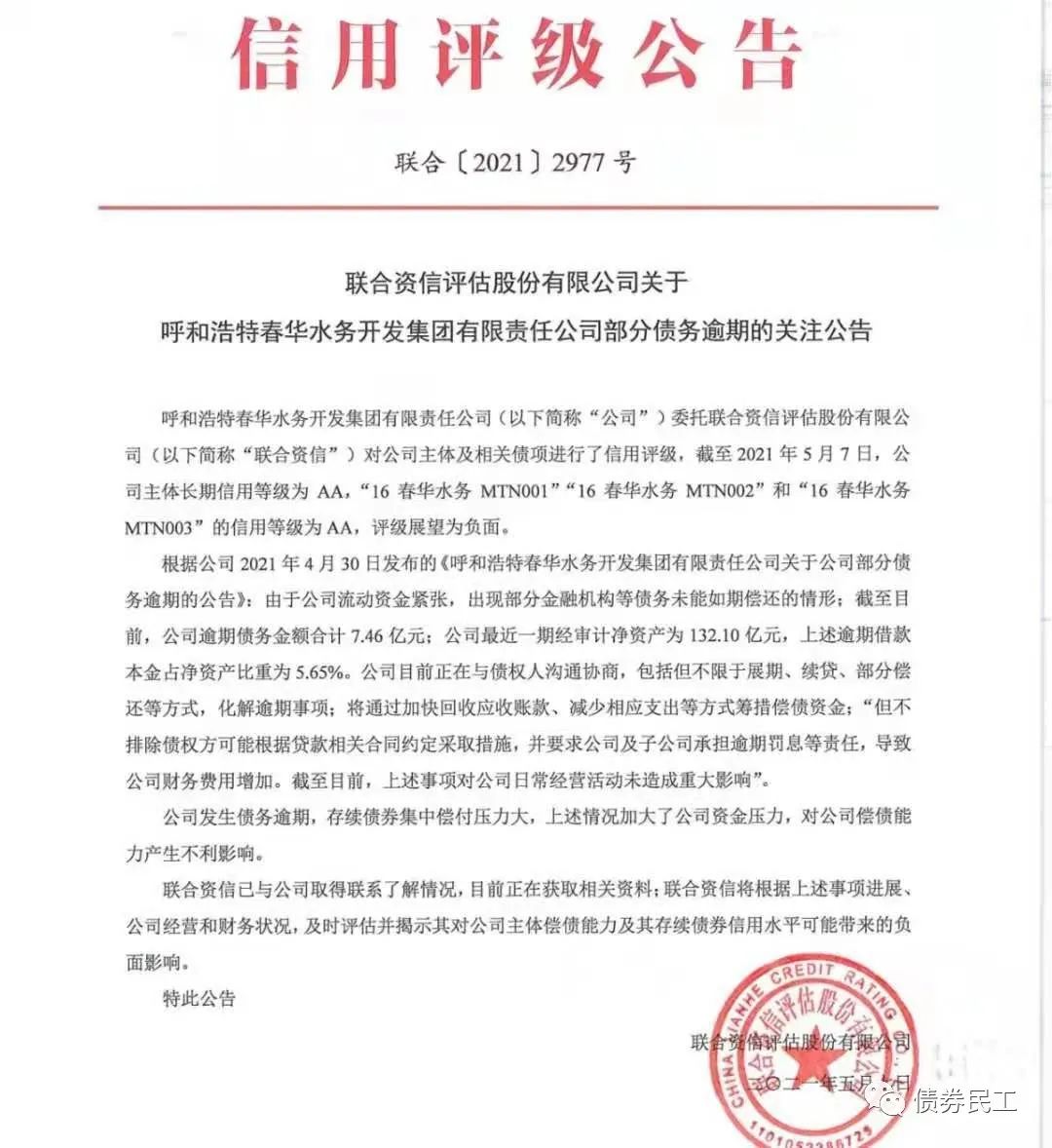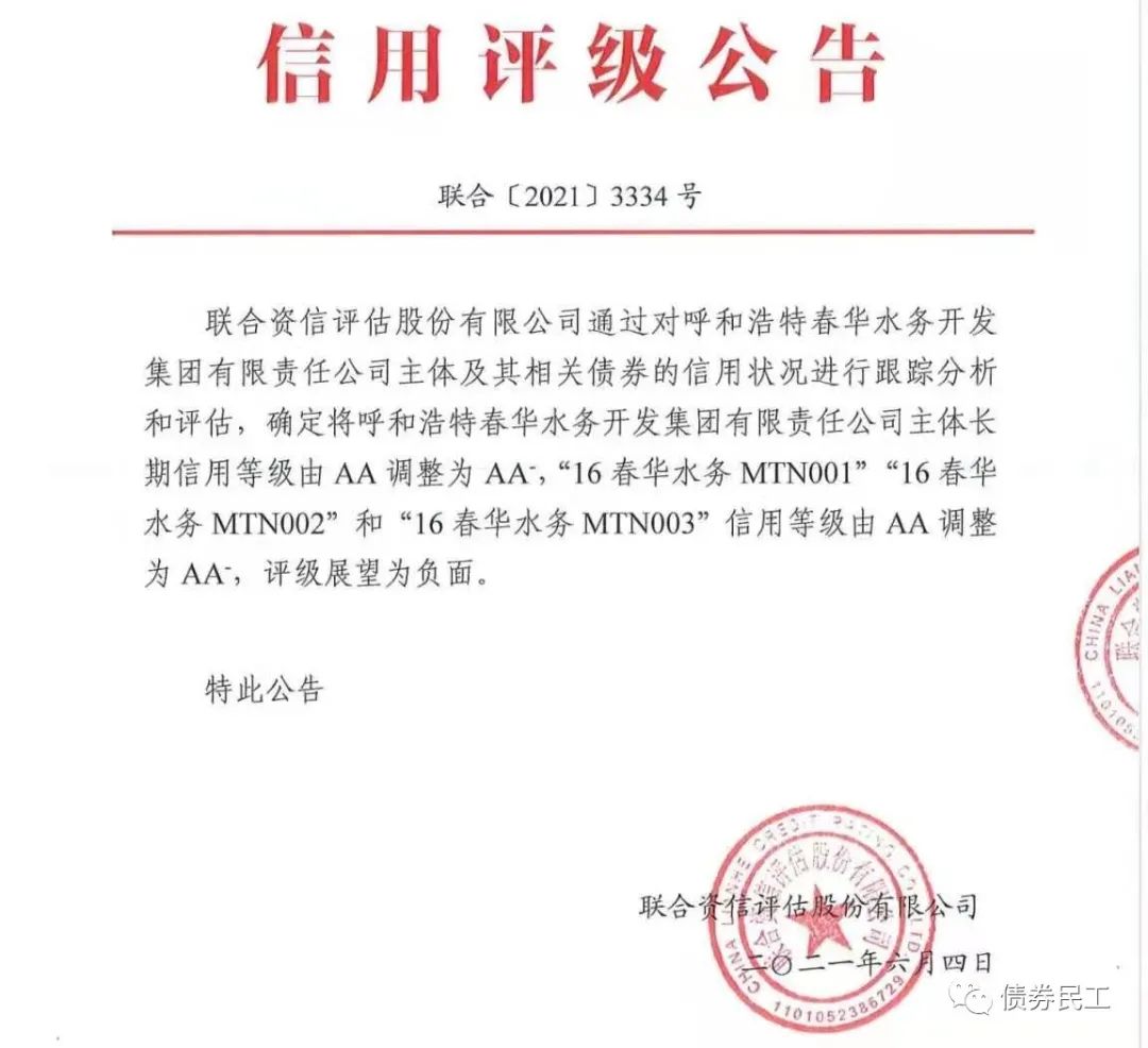 在此之前的2021年5月7日,聯(lián)合資信評估股份有限公司披露了《關(guān)于呼和浩特春華水務(wù)開發(fā)集團有限責(zé)任公司部分債務(wù)逾期的關(guān)注公告》,將會持續(xù)跟蹤債務(wù)逾期事項對公司帶來的影響,但并未下調(diào)春華水務(wù)的主體信用評級。