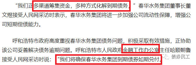 春華水務(wù)此次引起信用債券市場較大的關(guān)注始于2021年4月30日通過公告披露自身債務(wù)逾期事件。大家關(guān)注的焦點在于春華水務(wù)是否屬于城投公司以及后續(xù)是否會引發(fā)存續(xù)債券的違約。在春華水務(wù)債務(wù)逾期事件的發(fā)酵過程中,5月7日晚人民網(wǎng)刊登了《春華水務(wù)集團債務(wù)逾期總體可控 政府多措并舉緩解流動性》文章,春華水務(wù)董事長表示將“多種方式化解到期債務(wù)”,呼和浩特市金融工作辦公室主任表示“將確保春華水務(wù)到期債券如期兌付”。這是春華水務(wù)債務(wù)逾期之后,官方對于債務(wù)問題解決最直接的表態(tài),表達(dá)了解決春華水務(wù)債務(wù)問題的信心。